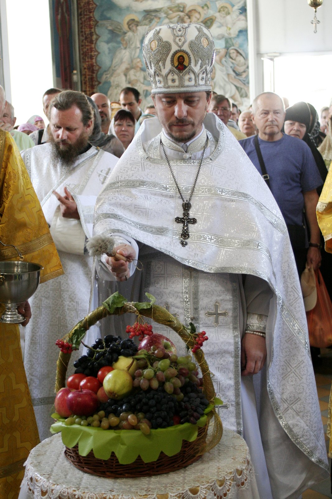 В завершение богослужения в центре храма, после пения праздничного тропаря и кондака с каждением, были прочитаны молитвы на освящение нового винограда и прочих плодов.