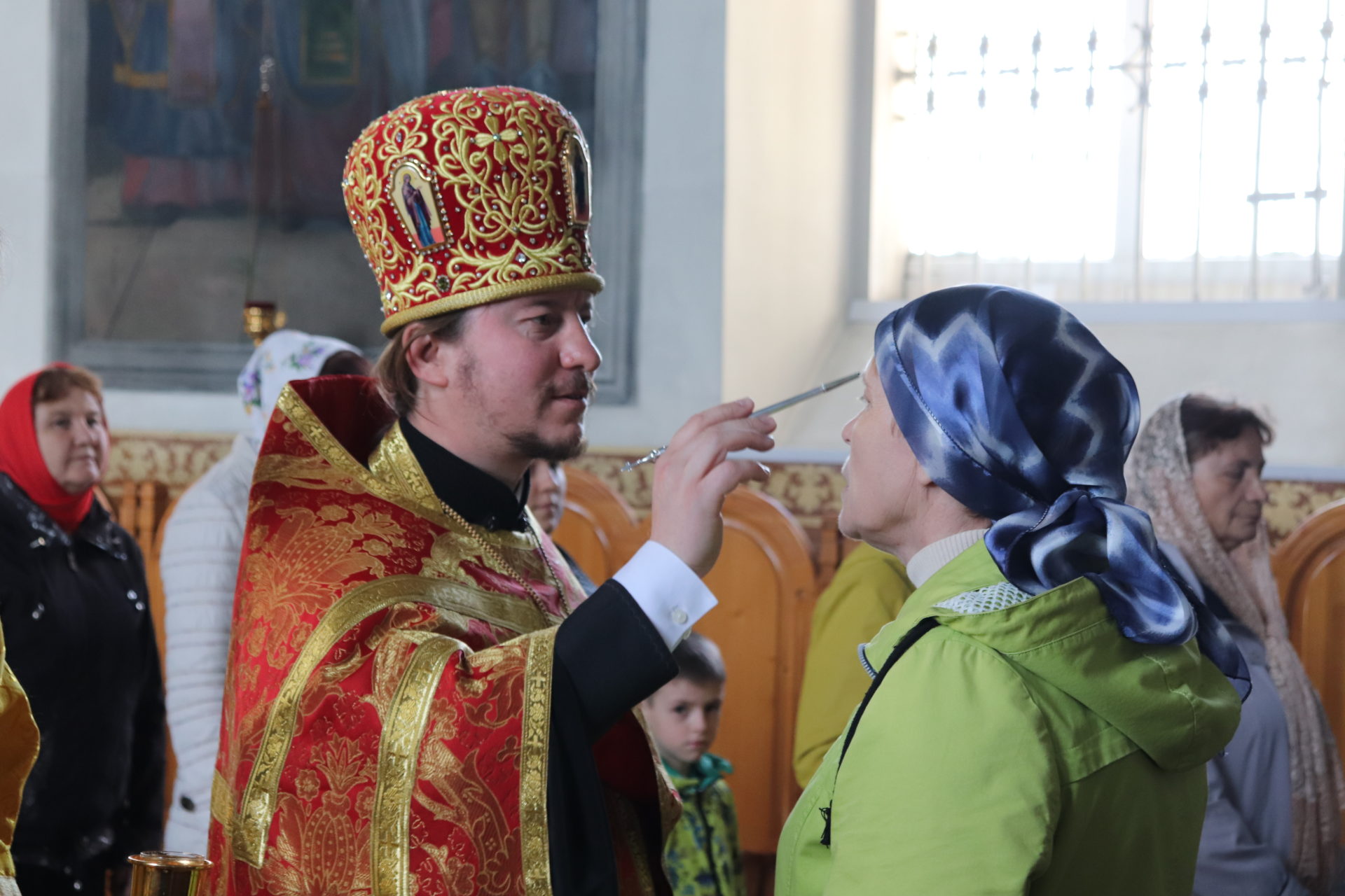 На утрени по полиелее совершено помазанием верующих освященным маслом с раздачей освященного хлеба с вином и елеем.